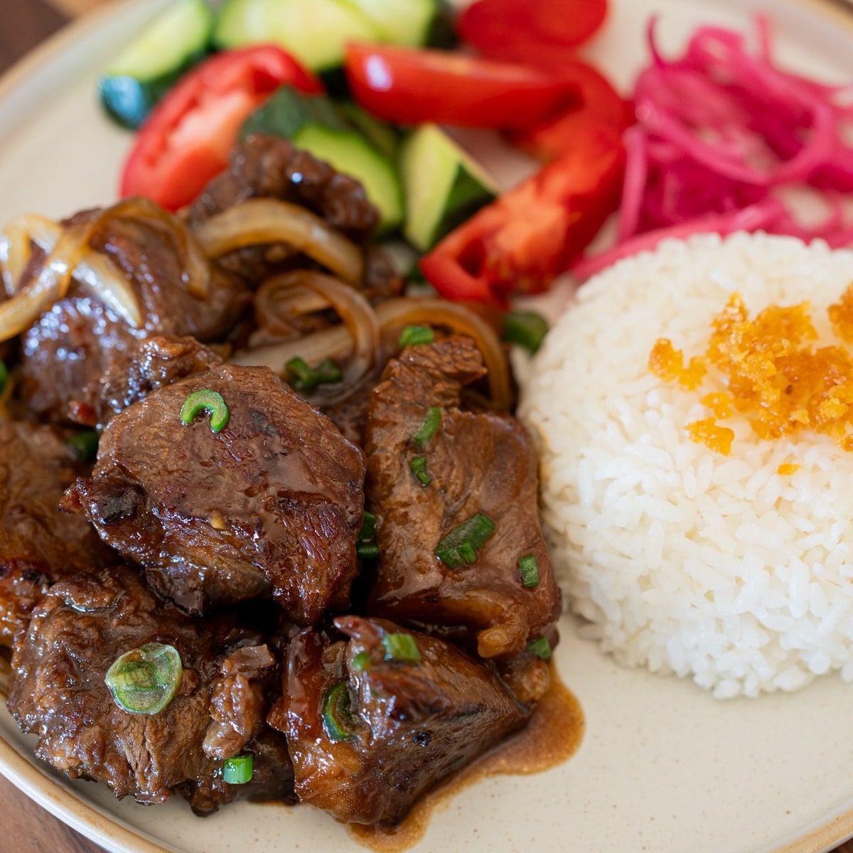 - Plate over steamed rice. Serve with all or any toppings you want. I served mine with pickled red onions, the tomato cucumber salad, and fried garlic on top of the rice.